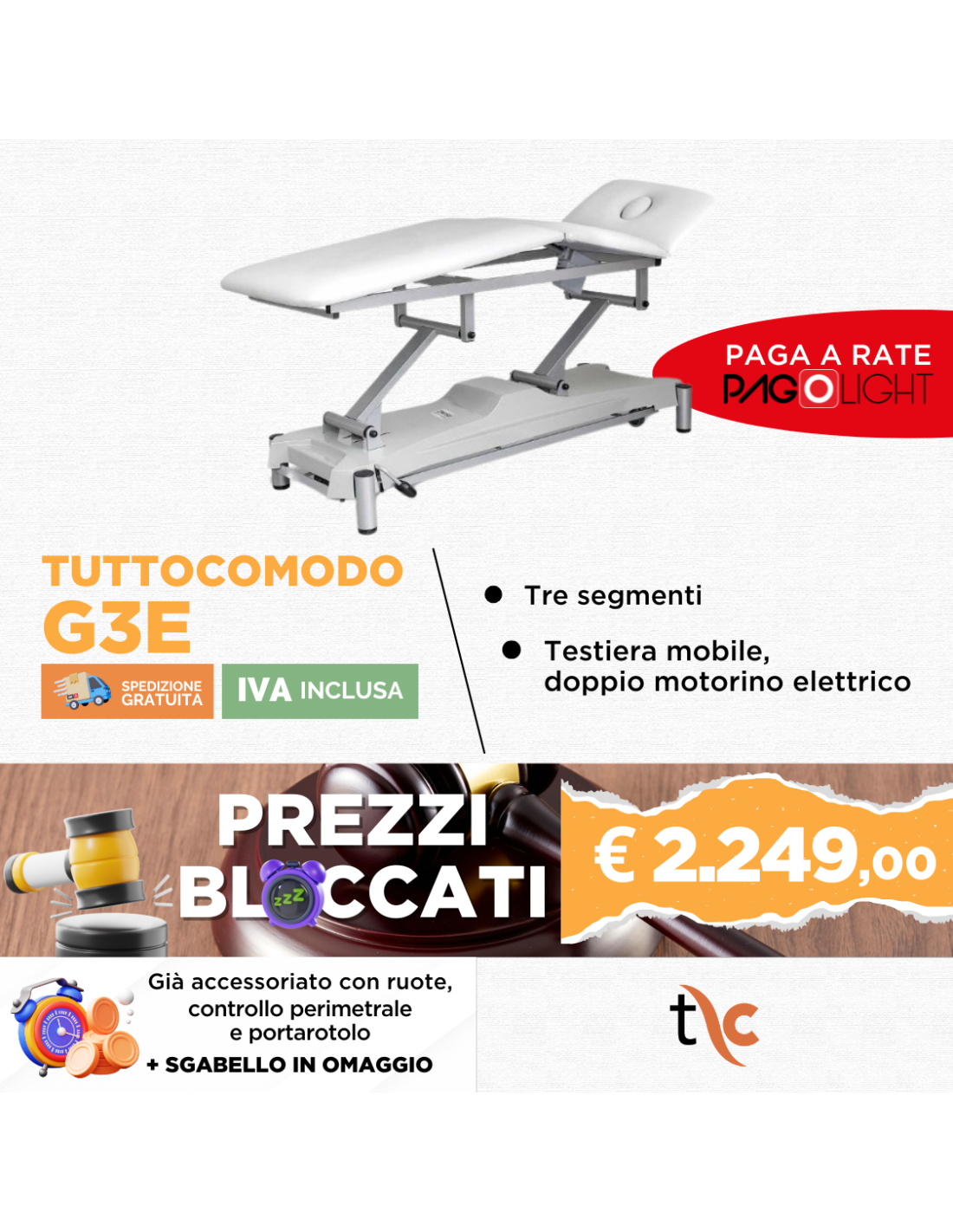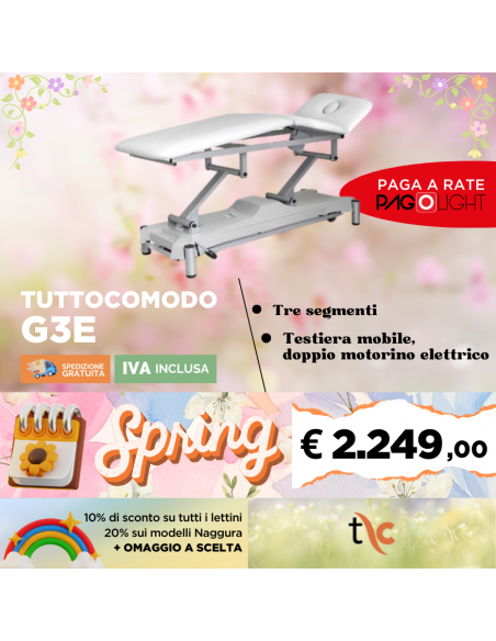 - Per questo motivo il lettino elettrico Tuttocomodo G3E è equipaggiato con due motorini elettrici che permettono la regolazione sino alla posizione di scarico, in modo da poter eseguire particolari posizioni di fisioterapia, osteopatia e chiropratica.