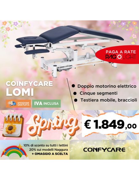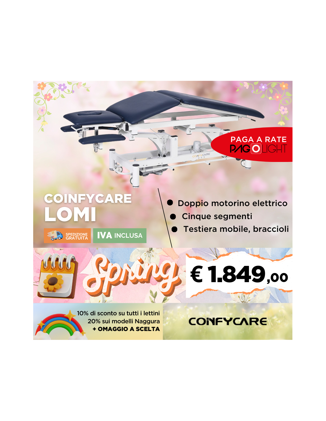 Il lettino Lomi è un lettino a cinque sezioni con doppio motorino elettrico e testiera divisa in tre segmenti. Adatto alla terapia manuale, offre un'ottima stabilità durante i trattamenti osteopatici I due bracci d'alzata donano al prodotto una estrema stabilità, tale da non perdere la forza del trattamento sia con pazienti più pesanti che meno.