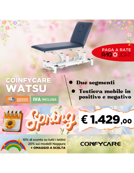 Il Lettino elettrico Coinfycare Watsu è indicato per osteopatia e fisioterapia. Dimensioni 195 x 66 cm; due segmenti.