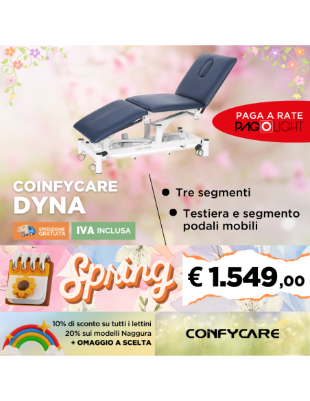 Il lettino Coinfycare Dyna è provvisto di tre sezioni con alcuni particolarità. La testiera per misure è più simile ad uno schienale ovviamente movimentabile in positivo e negativo; allo stesso tempo il segmento podale ha diverse angolazioni in positivo e negativo gli permettono di divenire quasi una poltrona.