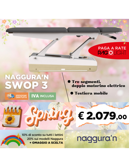 Il Lettino elettrico Naggura Swop 3 è indicato per l'osteopatia e la fisioterapia. Dimensioni 202 x 68 cm; due segmenti