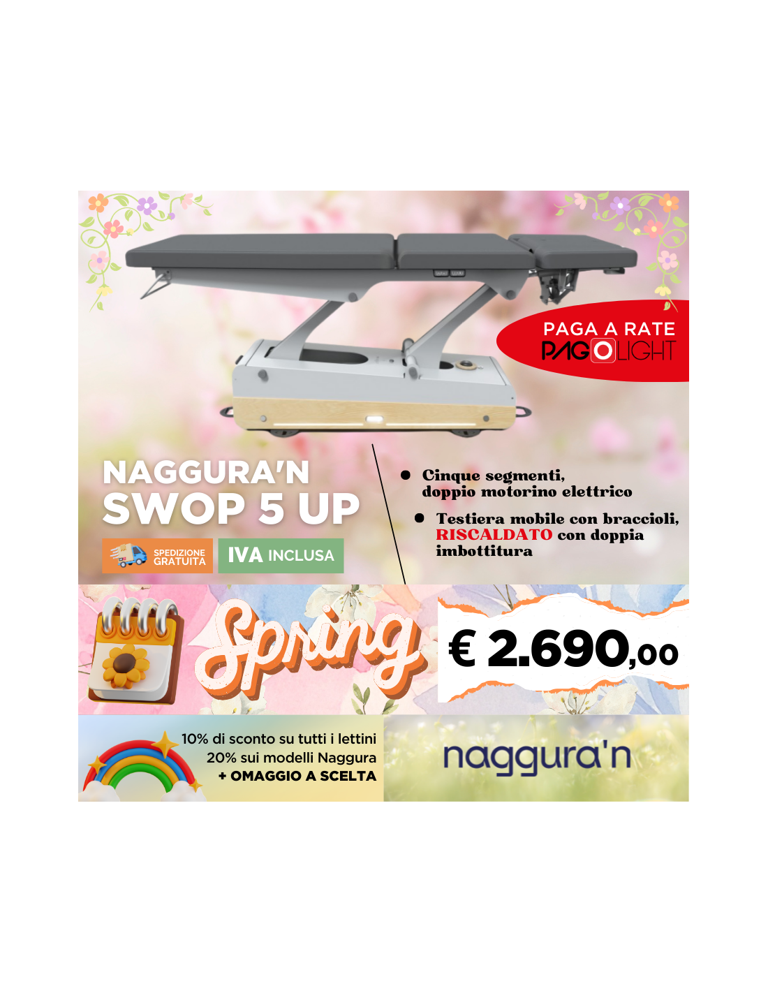 Il Lettino elettrico Naggura Swop 5 Up è indicato per l'osteopatia e la fisioterapia. Dimensioni 204 x 70 cm; cinque segmenti