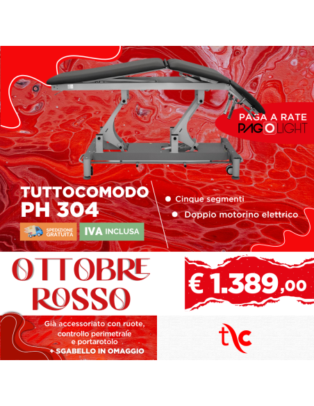 Il lettino elettrico Tuttocomodo PH304 è indicato per fisioterapia e osteopatia. Dimensioni 196 x 68 cm; tre segmenti doppio motorino elettrico