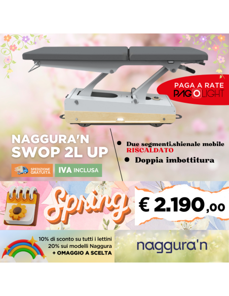 Il Lettino elettrico Naggura Swop 2L up è indicato per l'osteopatia e la fisioterapia. Dimensioni 204 x 70 cm; due segmenti